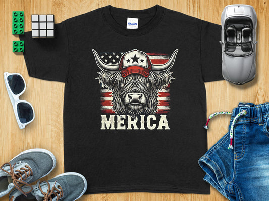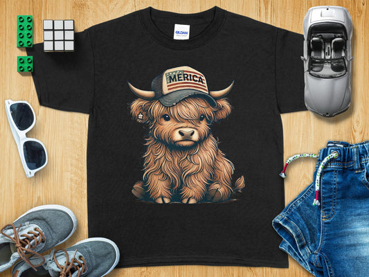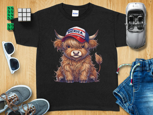 Vintage Merica Patriotic Highland Cow Youth Tee