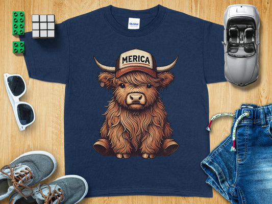 Merica Patriotic Highland Cow Youth Tee